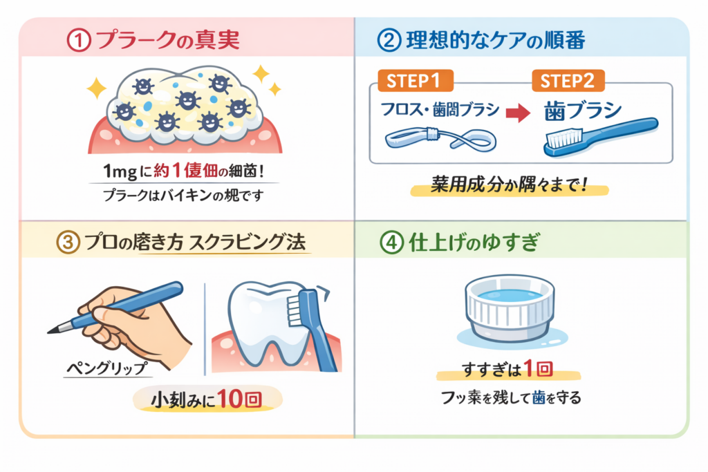 私たちが歯を磨く最大の目的は、食べかすを取り除くことではありません。真の目的は**「プラーク(歯垢)」の除去**です。
